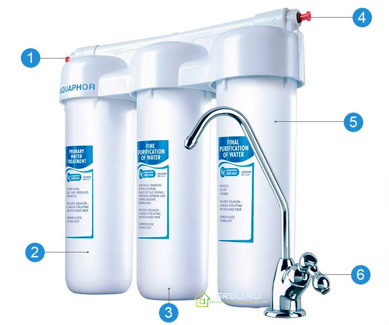 Le dispositif des principaux composants du filtre de flux "sous l'évier": 1. Noeud pour la connexion de l'eau; 2. le filtre de sorption préliminaire ou de nettoyage mécanique; 3. Filtre de nettoyage par sorption en profondeur; 4. Noeud pour connecter une grue; 5. Filtre pour le nettoyage final et le conditionnement; 6. La grue. * (L'ensemble des modules de filtrage dépendra du modèle de filtre spécifique).