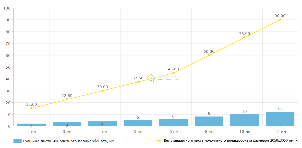 Dépendance du poids d'une feuille standard de polycarbonate monolithique, taille 2050x3050 mm, de son épaisseur.