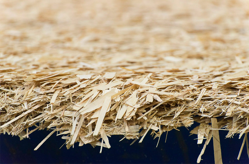 Les panneaux de particules orientés agissent comme les couches extérieures entre lesquelles est posé le polystyrène expansé.