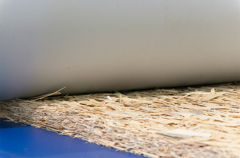 3. Composition pour moulage et moulage. En tant que liant pour panneaux OSB, on utilise de la cire et des adhésifs à base de paraffine, de résine phénol-formaldéhyde ou d'isocyanate et d'acide borique, avec lesquels les copeaux sont mélangés par étapes. Ensuite, le mélange résultant est transféré au poste de moulage, où il est roulé et moulé dans un tapis homogène avant d'être envoyé à la presse.