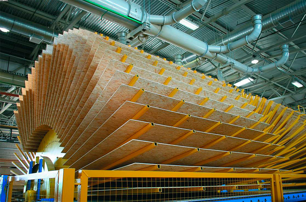 5. Découpe et conditionnement. Après un contrôle de qualité, le canevas OSB est découpé en éléments de format standard, les bords de ces éléments sont profilés et les cartes résultantes sont envoyées à la ligne de marquage et de conditionnement.