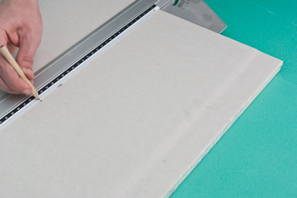 #1. Le panneau de gypse est constitué de deux couches de papier qui recouvrent des deux côtés une épaisse couche de gypse. Cette combinaison crée un matériau de construction relativement résistant, qui résiste également au feu. Par conséquent, pour obtenir une coupe précise et de haute qualité, il suffit de marcher le long de la plaque avec un couteau tranchant, puis de la casser à cet endroit. Pour faire une incision, passez plusieurs fois le couteau sur la feuille de gypse. Pour effectuer la coupe correcte, vous devez diriger le couteau avec confiance, sans saccades et précisément le long de la ligne tracée. En coupant à travers la couche de papier, vous devez maintenir fermement la bande de roulement dans une position, sinon la coupe risque de se révéler inégale.