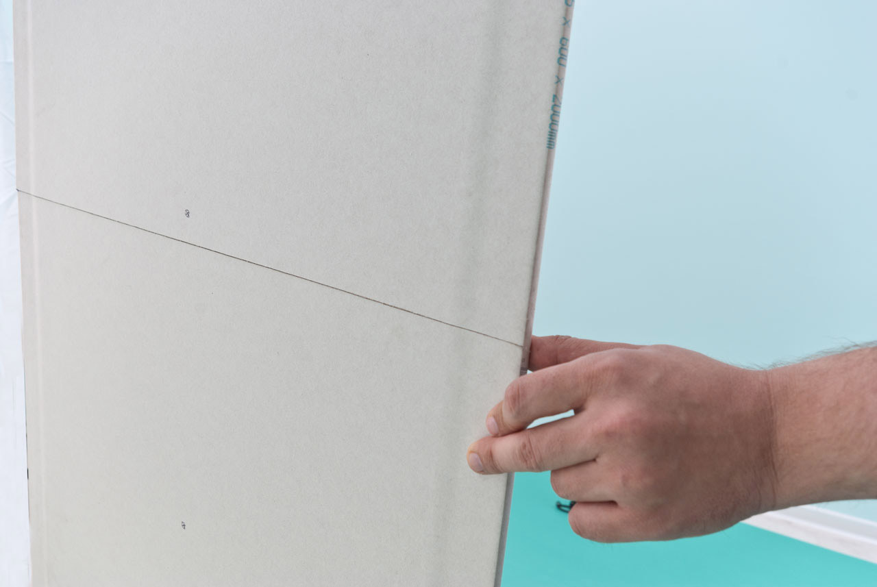 #2. Maintenant, vous devez casser la plaque le long de l'incision. Si vous avez correctement suivi les étapes précédentes, la feuille de gypse devrait se rompre le long de l'incision. En tenant le drap avec vos pieds, pliez-le simplement.