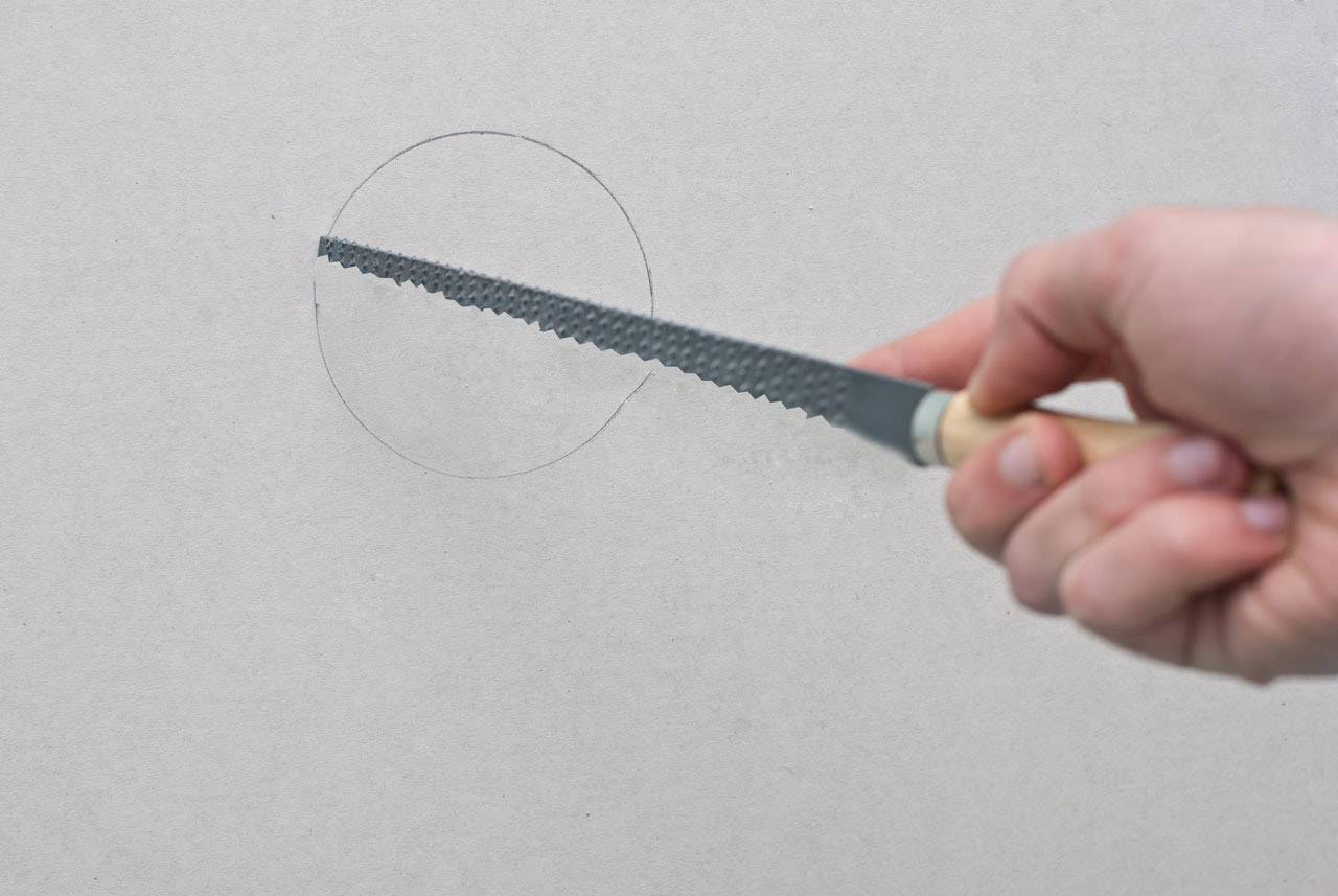 Ensuite, à l’aide d’une scie à cloison sèche, découpez un trou dans la plaque. Afin de rendre le trou uniforme, casser la cloison sèche à un endroit et, à partir de là, commencer à scier.