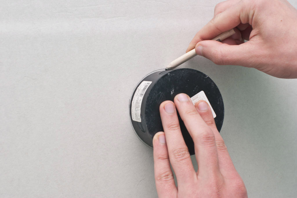 Méthode 1 Coupez un trou rond dans le gypse avec un couteau conventionnel. Vous devez d’abord définir la forme du futur trou.Pour ce faire, vous pouvez attacher une boîte d'une prise murale, un commutateur ou tout autre objet rond à une feuille de gypse et dessiner le contour du futur trou. Ensuite, le même contour doit être noté au verso de la feuille. Et les premier et deuxième circuits doivent correspondre.