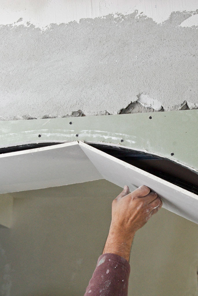 Avant de commencer à vous pencher directement, l’eau devrait être absorbée par les cloisons sèches pendant environ une heure. À utiliser avec précaution, car un panneau humide est très facile à endommager. Une fois que vous avez donné à la plaque de gypse la forme souhaitée, vous devez ventiler la pièce pour éliminer l'humidité excessive.
