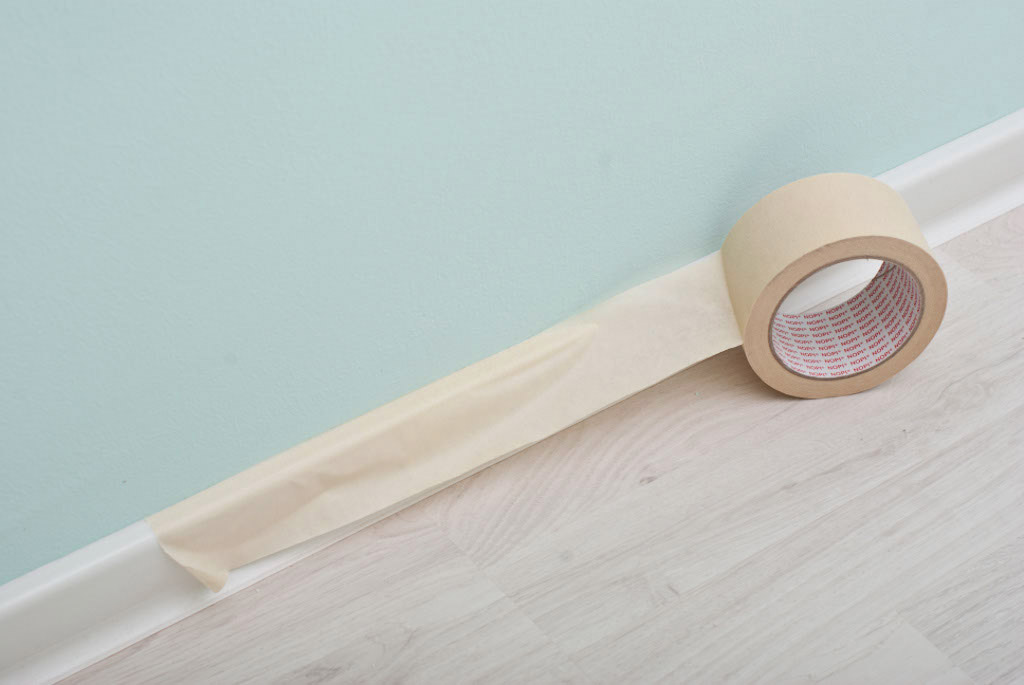La prochaine étape consiste à protéger contre les éventuelles taches et gouttes de peinture de la plinthe et des autres éléments intérieurs. Pour ce faire, vous aurez besoin de ruban de masquage - un matériau peu coûteux mais très utile.