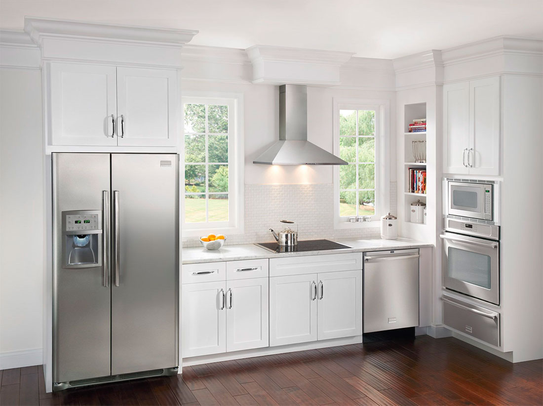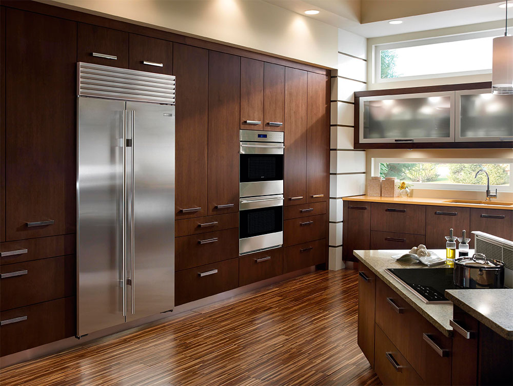 Les réfrigérateurs indépendants côte à côte attirent les yeux des visiteurs, leur conception doit donc être choisie en tenant compte de l'intérieur général de la cuisine. Pour les modèles intégrés, ce problème n’est pas aussi pertinent. Ils peuvent être complètement cachés dans la cuisine ou ne comporter que des portes.