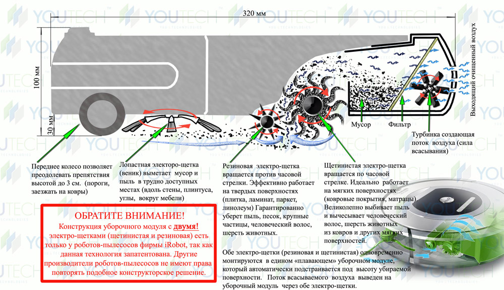 Le robot aspirateur enlève les gros débris avec une brosse spéciale (dont il a un ou deux dans un jeu). Pour atteindre des endroits inaccessibles (par exemple, près des pieds de meubles, dans les coins, près du mur), il a de petites brosses latérales en réserve.