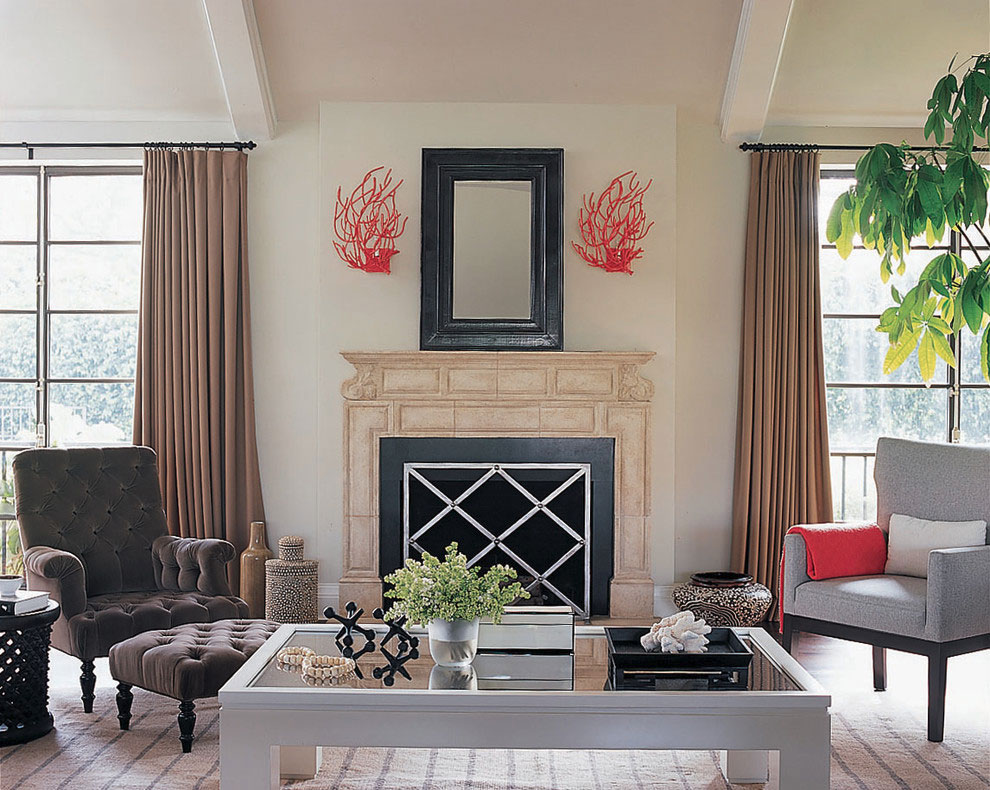 Gayunpaman, sa murang kayumanggi mayroong isang bagay na katulad ... lalo na kung pinagsama mo ito sa mga maliliwanag na lilim ng pula! Hindi lamang ito naka-highlight ng makulay na kulay laban sa isang background ng beige. Ang pula ay maaaring magdagdag ng mas maraming drama kaysa sa mga cool na kulay tulad ng purong puti. Sa ibaba makikita natin ang mga coral branch sa magkabilang panig ng salamin sa isang itim na frame. Mahirap na huwag pansinin ang kulay pula na kulay kahel, lalo na dahil binigyang-sigla nito ang makulay na kulay ng bedspread na nakahiga sa armrest ...