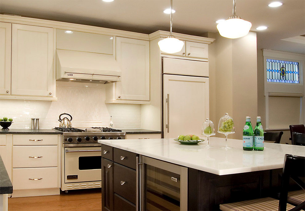Beige at berde na kulay sa kusina.