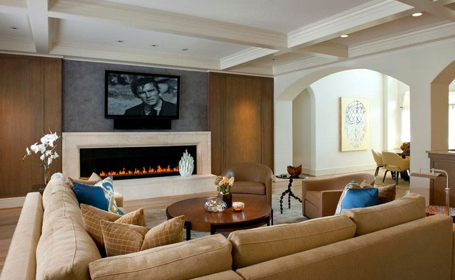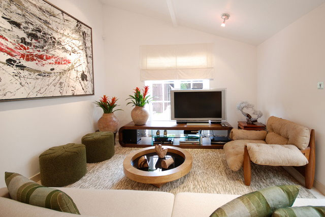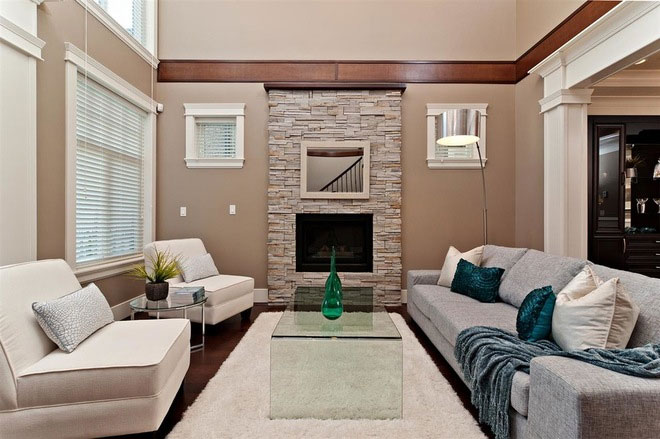Kapag ang beige, asul at berde ay pagsamahin, ang resulta ay nakamamanghang. Ito ay makikita sa litrato sa ibaba ng sala. Ang dilaw-berde na mga dahon ay mas mababa sa emerald-green vases, atensyon mula sa kung saan pupunta sa berde-asul na unan ng silid na ito, nilikha ng Positive Space Staging + Design Inc.