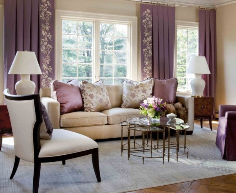 Ang mga shade ng lila sa isang beige living room.