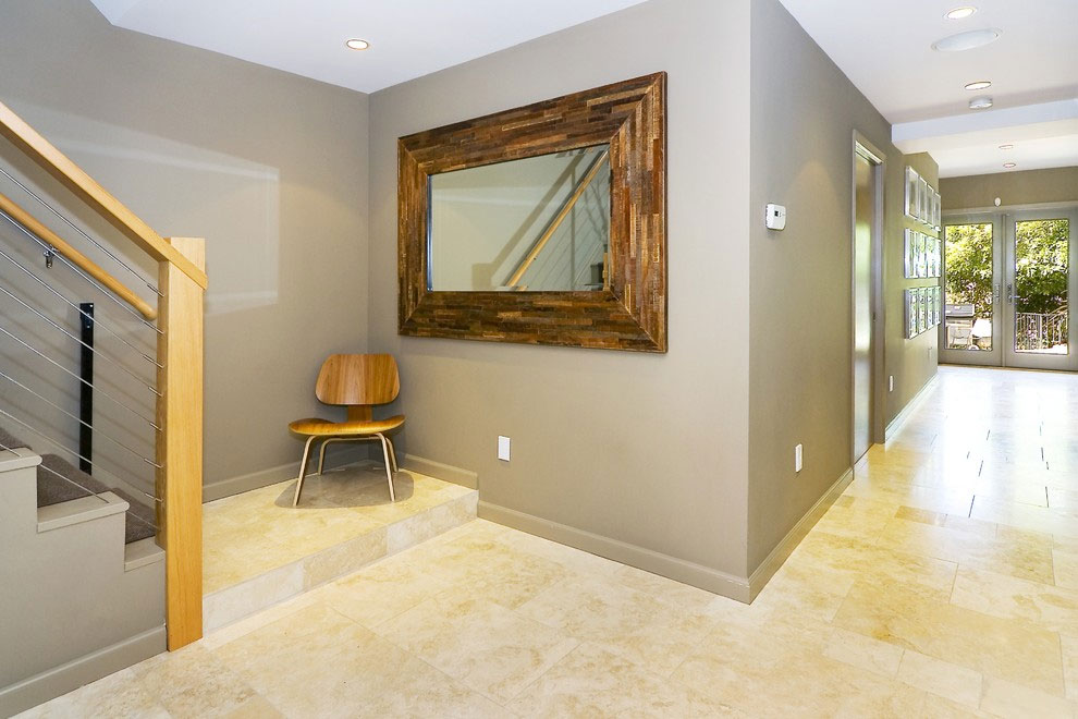 Ang mga sumusunod ay mga kagiliw-giliw na lilim ng beige sa loob ng isang modernong hagdanan. Napapansin namin ang isang kasaganaan ng mga mainit na tono, kabilang ang isang banilya na lilim ng mga tile sa sahig, isang malaking salamin sa isang frame ng puspos na mga kulay na kayumanggi, at isang upuan na gawa sa gintong kahoy.