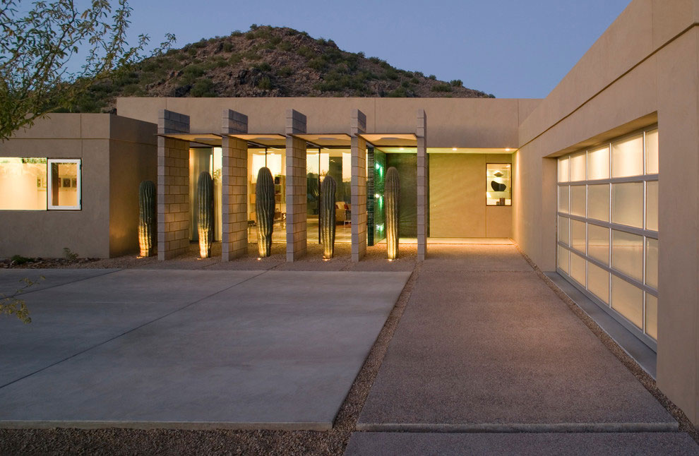 Ang Beige ay isang sikat na kulay para sa modernong panlabas na dekorasyon din, tulad ng nakikita sa sumusunod na larawan. Mangyaring tandaan na ang bahay mismo, graba, at mga aspaltadong landas - lahat ay may mga shade ng beige. Pinahahalagahan din kung paano ang mga ginintuang ilaw sa labas ng bahay ay makakatulong na maipaliwanag ang buong puwang, na nagsumite ng mga maiinit na anino mula sa mga elemento ng beige.