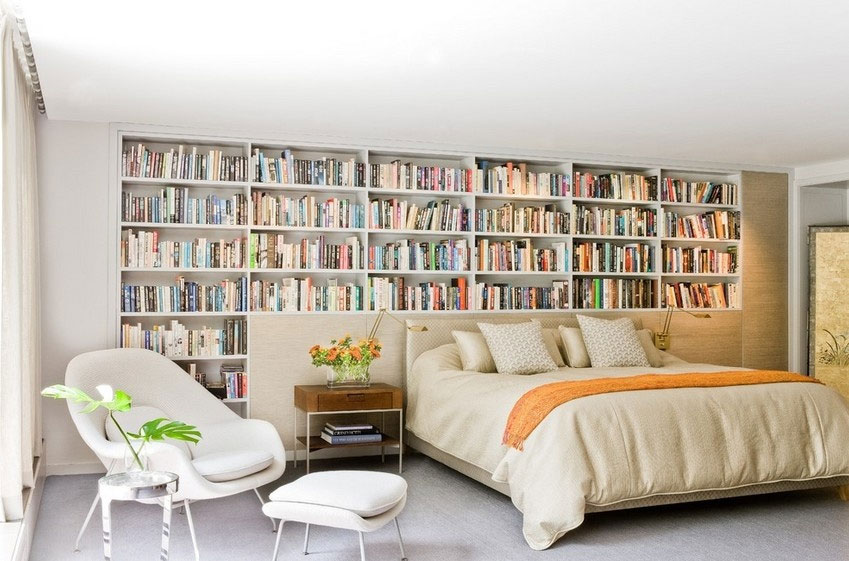 Sa modernong silid-tulugan na ipinakita sa sumusunod na larawan, ang isang beige palette ay nagsisilbing isang kamangha-manghang backdrop para sa isang koleksyon ng mga libro na mukhang masigla laban sa isang dingding na may kulay na dingding. Sa kasong ito, ang kulay ng dingding ay hindi makagambala sa laro ng mga kulay ng bahaghari ng mga takip ng libro. Bigyang-pansin din kung paano malinaw na nakatayo ang orange.